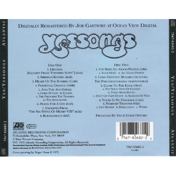 1-1 Opening (Excerpt From "Firebird Suite") 3:45 1-2 Siberian Khatru 8:50 1-3 Heart Of The Sunrise 11:26 1-4 Perpetual Change 14:08 And You And I (9:55) 1-5a Cord Of Life 1-5b Eclipse 1-5c The Preacher The Teacher 1-5d The Apocalypse 1-6 Mood For A Day 2:52 1-7 Excerpts From "The Six Wives Of Henry VIII" 6:35 1-8 Roundabout 8:33 I've Seen All Good People (7:00) 2-1a Your Move 2-1b All Good People Long Distance Runaround / The Fish (Schindleria Praematurus) (13:45) 2-2a Long Distance Runaround 2-2b The Fish (Schindleria Praematurus) Close To The Edge (18:41) 2-3a The Solid Time Of Change 2-3b Total Mass Retain 2-3c I Get Up I Get Down 2-3d Seasons Of Man 2-4 Yours Is No Disgrace 14:21 Starship Trooper (9:25) 2-5a Life Seeker 2-5b Disillusion 2-5c Würm