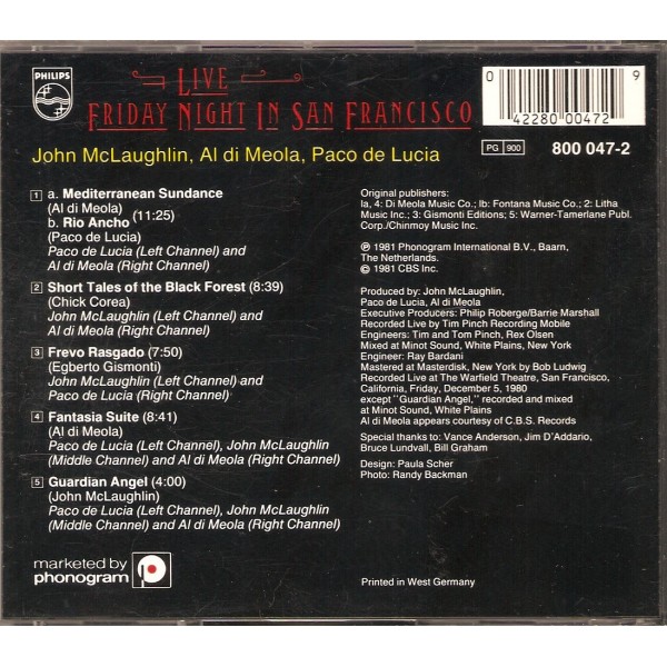 CD Al Di Meola John Mclaughlin Paco De Lucia- friday night in san francisco