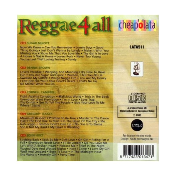 Reggae 4all un fantastico cofanetto contenente ben 5 album dei più rappresentativi del genere, Sugar Minott, Dennis Brown, Cornell Campbell,Gregory Isaacs e John Holt. NUOVO